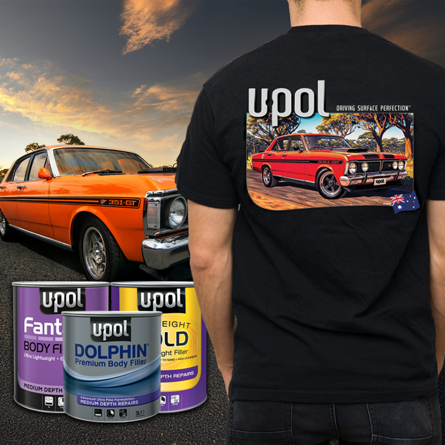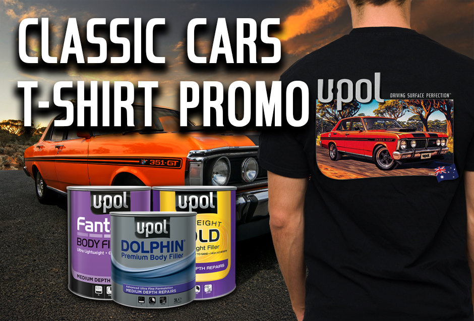 BUY ANY 3L TIN OF U-POL DOLPHIN, FANTASTIC, OR LITEWEIGHT GOLD AND RECEIVE A LIMITED EDITION, U-POL CLASSIC CARS OF THE WORLD T-SHIRT